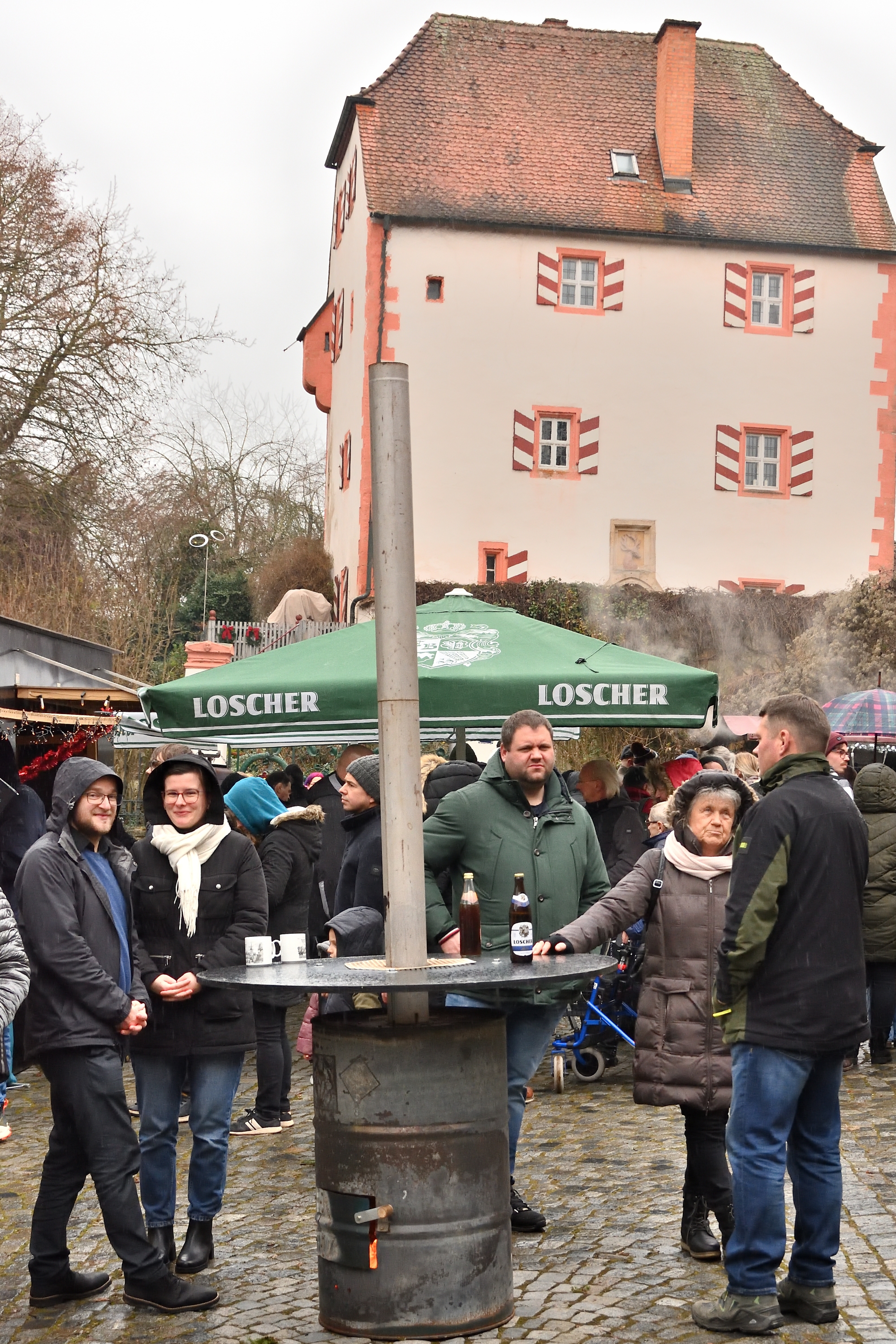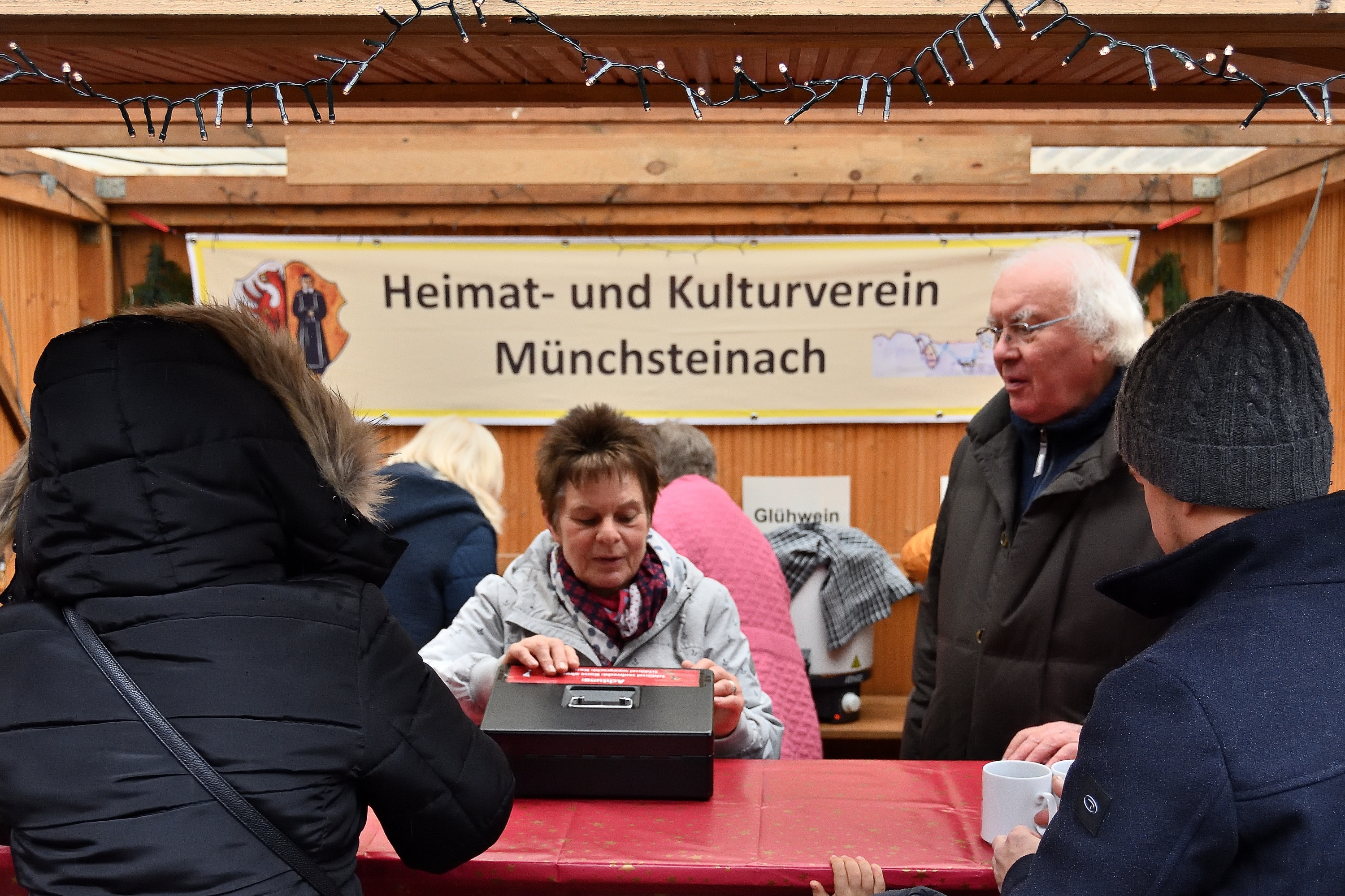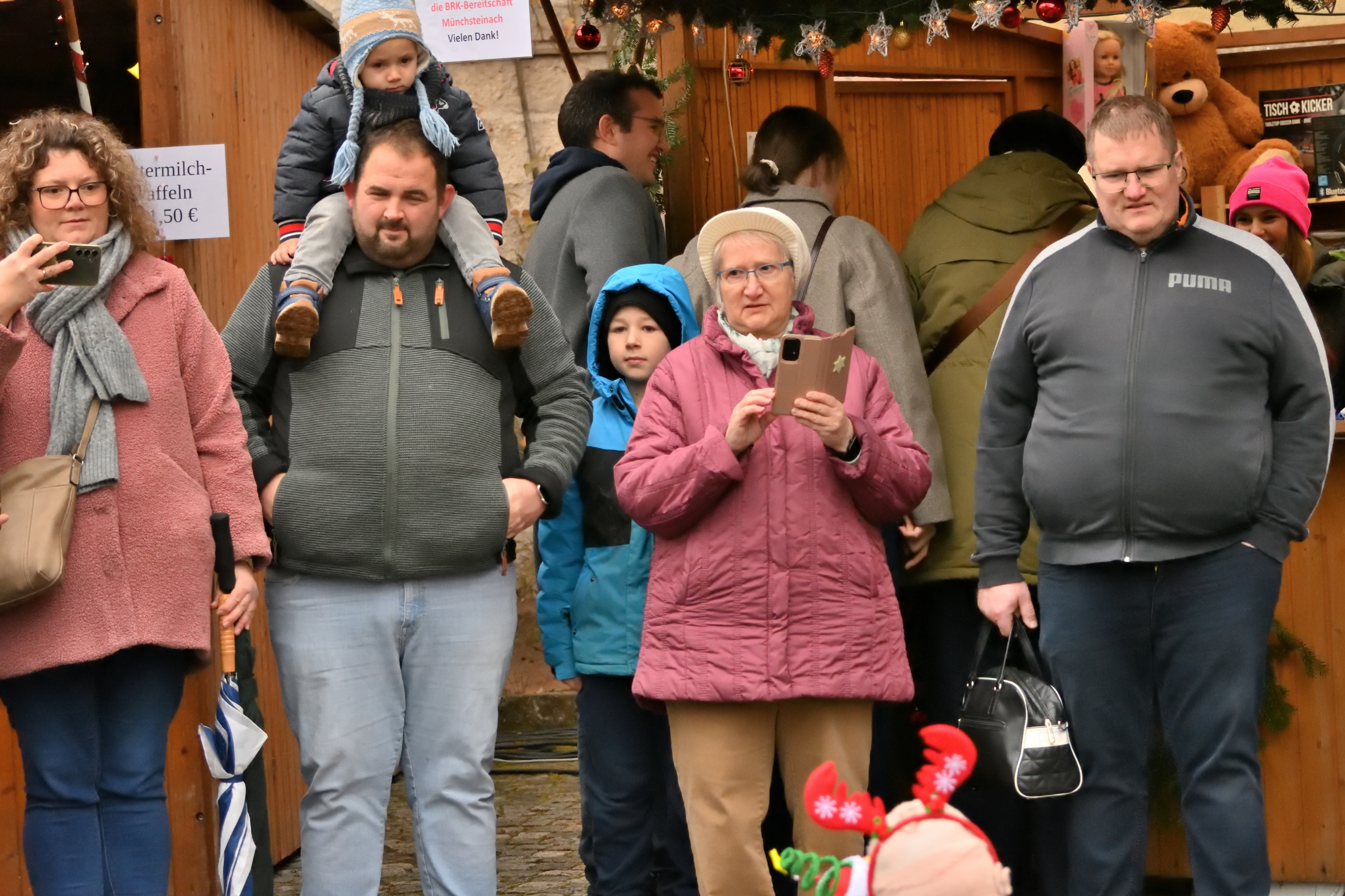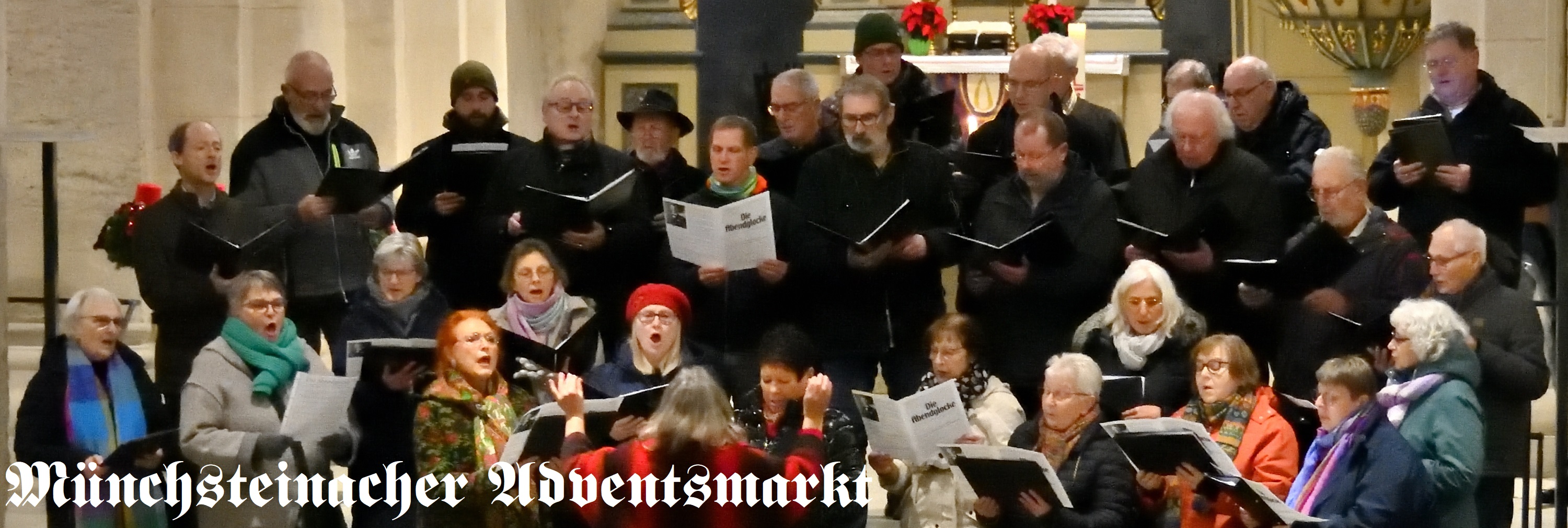 Grauer Himmel, Nieselregen, Kälte … in Münchsteinach selbstverständlich auch dann die Formel für eine erfolgreiche Veranstaltung, diesmal der alljährliche Adventsmarkt. So war es wieder am Sonntag, den 1. Advent (November 30). Mit Bratwurstduft, Glühwein und dem Loscher Winterbier braucht man nicht länger an Petrus und seine unfreundliche Haltung denken. Als Erste bewiesen das stolze Eltern und Familien als ihre Kindergartenkinder das große Publikum mit Tanz und Gesang amüsierten. 1. Bürgermeister Jürgen Riedel folgte mit seinem letzten Adventsmarktgruß. Er kandidiert nicht für die Wiederwahl im März. Nach dem Bürgermeister erschien das Christkind in Begleitung seiner Engel, um das Protokoll zu lesen. Der Marktbetrieb ging dann los. Das Brot für die Welt Café hatte schon Kaffee und Kuchen bereit, um die Besucher aufzutauen. Die nasskalten Kinder haben sich bei Bastelarbeit im 1. Stock der Münsterklause erwärmt als Christine Fobbe in der arktischen Kälte des Nikolausmünsters ihr Eröffnungswort zum Adventskonzert der Münchsteinacher Chöre sprach. Es musizierten sowohl der Singkreis, das Chörlein und der Männergesangverein als auch Christine Fobbe selbst im Solo mit einer beeindruckenden Interpretation von Panis angelicus. Nach dem Chorkonzert, weiterhin in eisiger Luft, hat der Posaunenchor ein Standkonzert mit Leiter Hans Loscher angeboten. Mit ihrer letzten Note begann allmählich der Marktausklang und die fröstelnden Menschen gingen heimwärts, gezielt auf die eigene warme Stube.