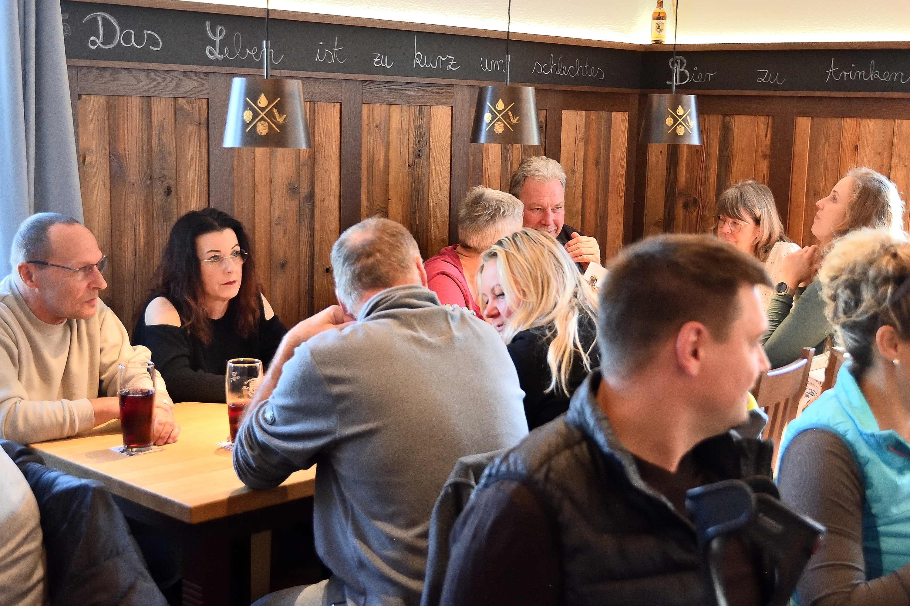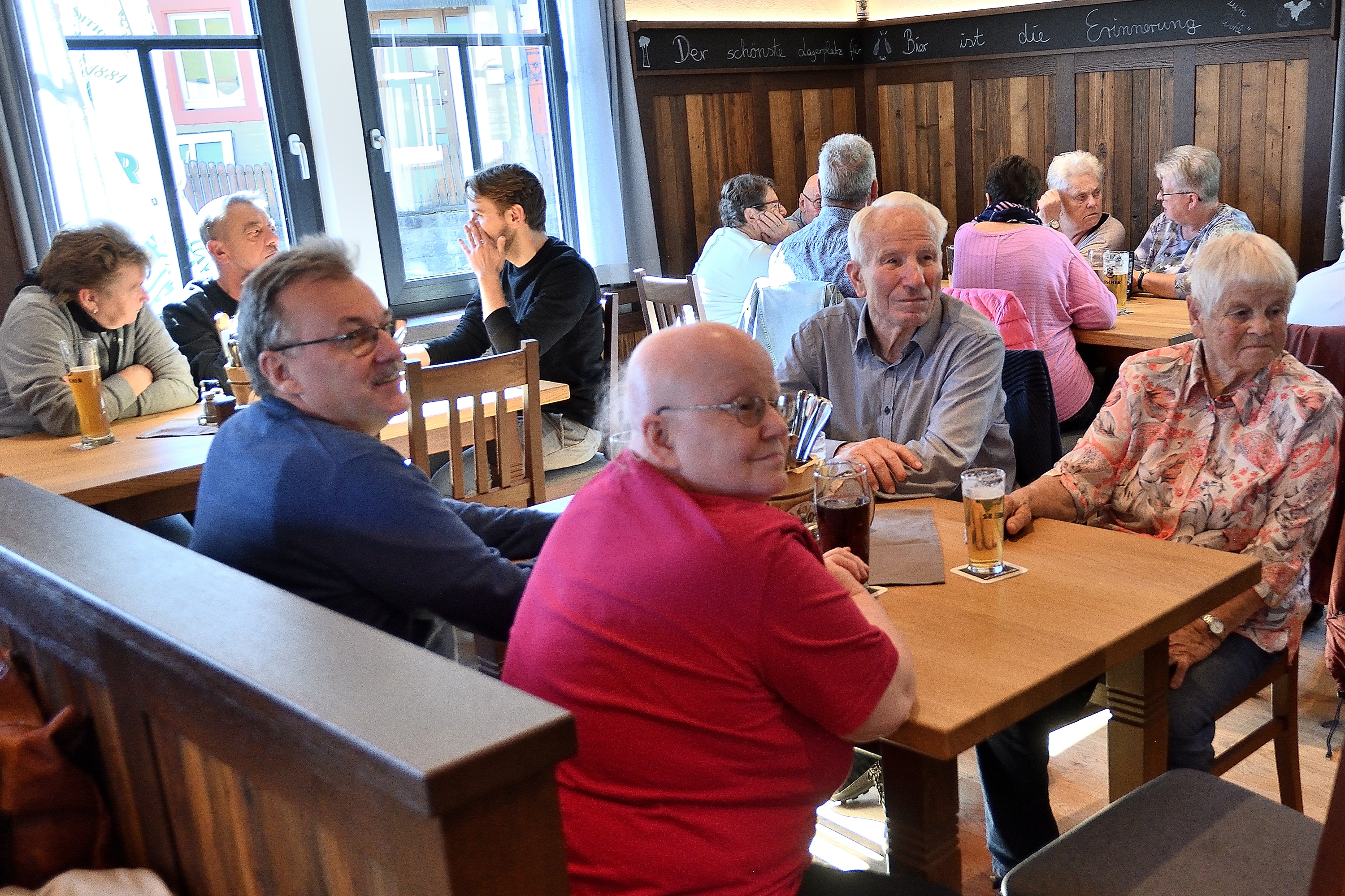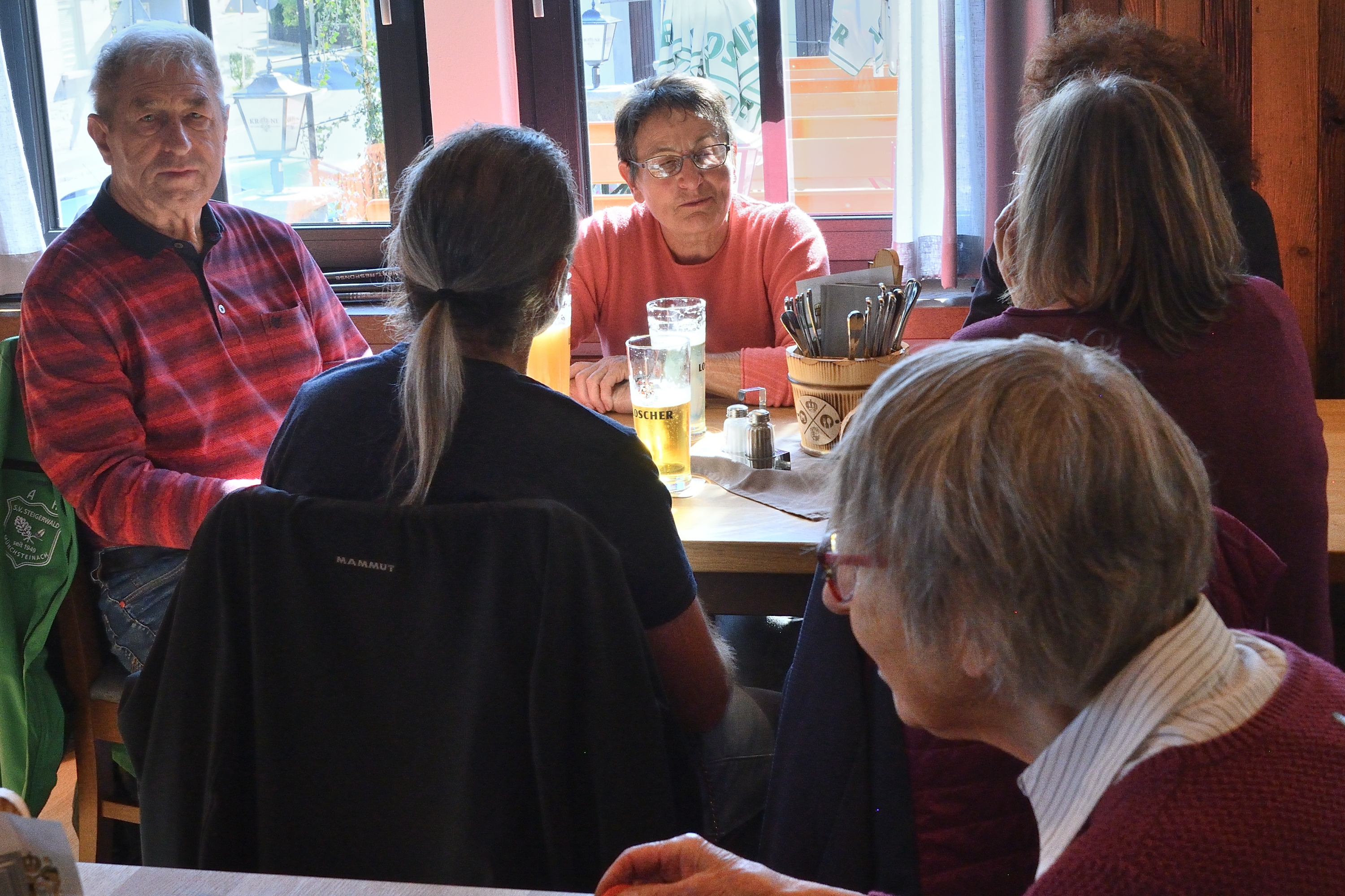Der Wandertag 2025 begann mit einer eisigen Temperatur von 0° C, aber als der Andacht mit Lektorin Elke Döller ein paar Stunden später begann, strahlte die Sonne und wärmte schnell die ca. 35 Wanderer auf. Nach ein bisschen mehr als 2 Stunden kam die Gruppe aus Altershausen, Abtsgreuth, Hombeer und Kienfeld nach Münchsteinach und kehrte in den neu renovierten Loscher Brauerei-Gasthof Krone ein. Dort trafen sie 16 zusätzliche Nachbarn, die nicht mitwandern konnten, für ein paar gemütlichen Stunden am Tag der deutschen Einheit, bevor es weiter auf Schusters Rappen heimwärts ging. |