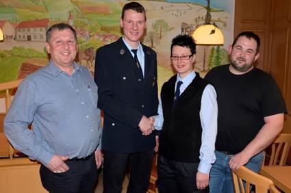 Führungswechsel - 2014 Altershausens langjähriger 1. Feuerwehrkommandant Norbert Friedrich, rechts, gratuliert seinem Nachfolger Andreas Dölfel, Mitte. Christian Detzel, links, übernimmt die Stelle des 2. Kommandanten von Andreas Dölfel. Beide wurden am Samstag für die nächsten 5 Jahre gewählt. Klicken Sie an, um das Bild anzuschauen.